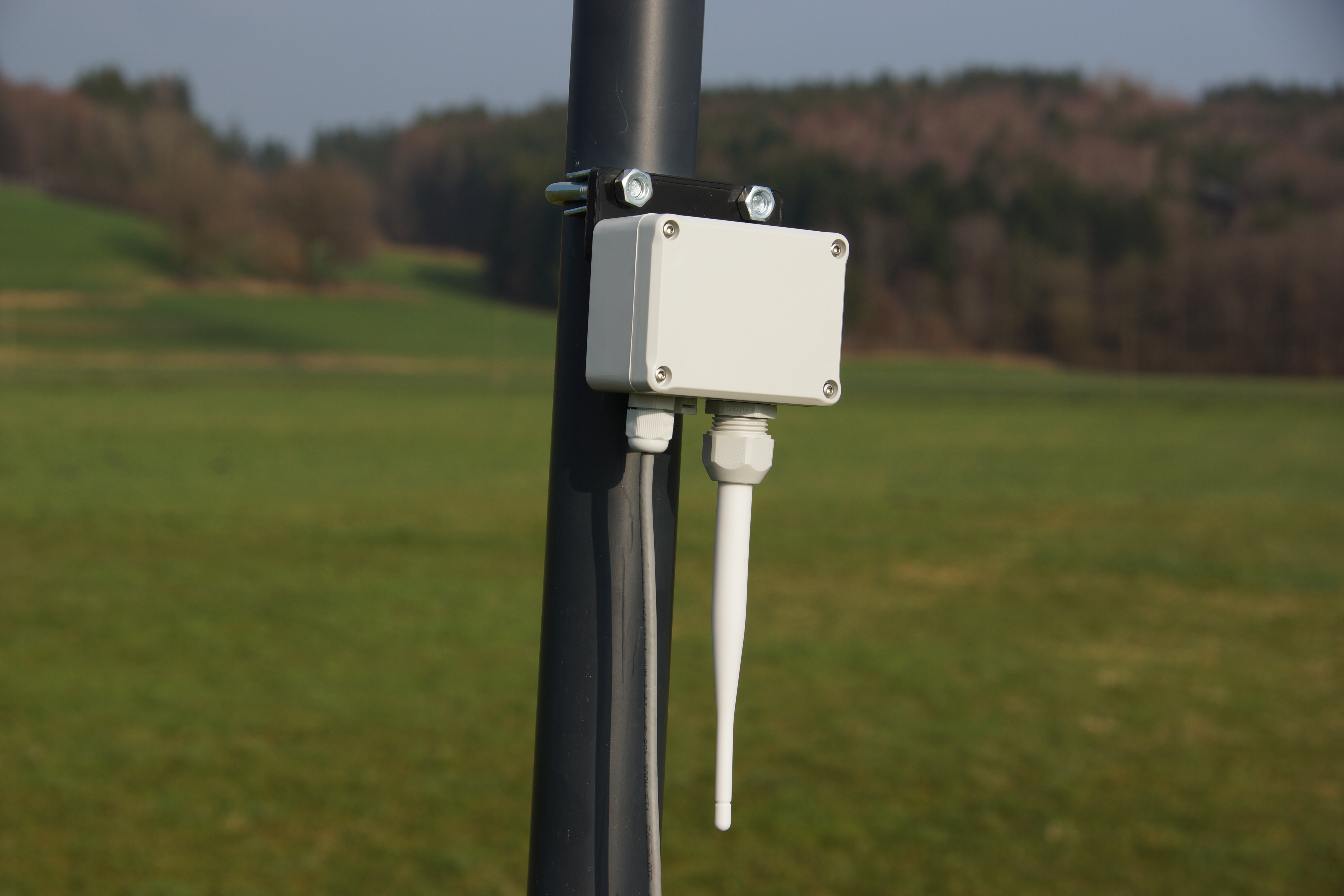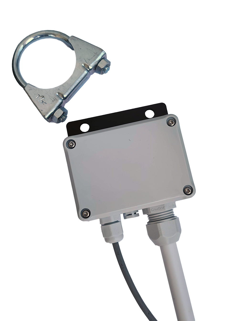 - Wetterfestes ABS-Gehäuse mit Kabelverschraubung, Druckausgleichselement und Befestigungsklemme für einen 48-mm-Mast.